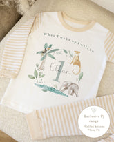 Beige & White Striped Personalised Birthday Pyjamas - Jungle Wreath Design