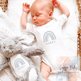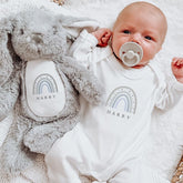 Beautiful personalised baby boys sleepsuit available with a matching personalised Soft Toy & Money box. Our 100% cotton baby clothes make the perfect gifts for new baby boys for all occasions, such as baby showers, christening or the upcoming Christmas season.