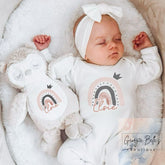 Beautiful personalised baby girls sleepsuit available with a matching gorgeous soft head wrap style headband (suitable from newborn) Soft personalised Soft Toy & Money box. Our 100% cotton baby clothes make the perfect gifts for new baby girls for all occasions, such as baby showers, christening or the upcoming Christmas season.